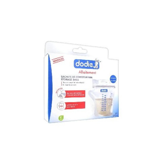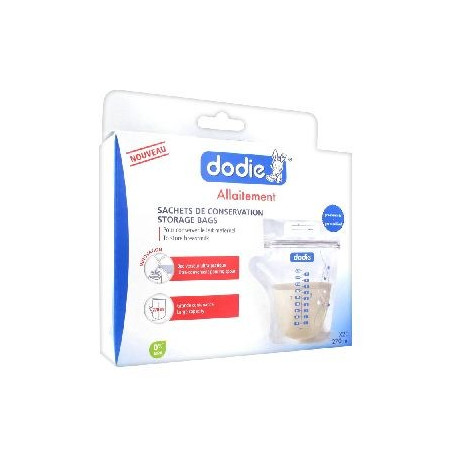 Dodie Sachet de Conservation 20 Sachets sont des sachets astucieux qui permettent de conserver le lait maternel. Ces sachets pratiques et hygiéniques peuvent contenir jusqu'à 270 ml de lait maternel, ils vous offrent une solution simple et efficace pour conserver au frigo ou au congélateur le lait maternel. Afin d'éviter tout risque de bactéries ou autre virus pour votre enfant, ces sachets sont pré-stérilisés, pour une hygiène optimale. Pratique, le bec verseur intégré permet un transfert direct et sans perte de lait, du sachet au biberon. Pour vous faciliter son ouverture, le sachet est déjà pré-découpé, et un zip de protection a été ajouté afin d'éviter les fuites. Afin de vous permettre de noter toutes les informations, chaque sachet est munis d'une surface d'écriture pour noter la date ainsi que la quantité de lait recueillie. 0% BPA.