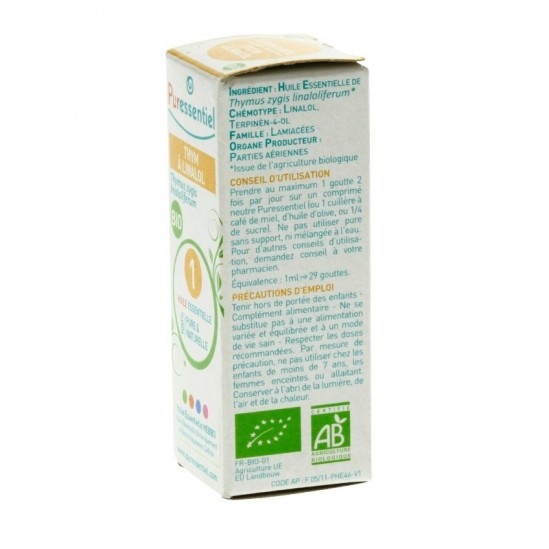 Précaution d'emploi : Comme toutes les huiles essentielles, celle de Thym à linalol est interdite pendant les 3 premiers mois de grossesse. Il ne faut pas non plus l’utiliser durant l’allaitement. Ne pas utiliser chez les enfants de moins de 3 ans.