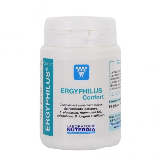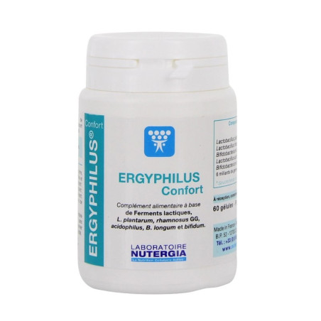 ERGYPHILUS Confort est composé de lactobacilles et bifidobactéries sélectionnés, en particulier L. plantarum et B. longum qui maintiennent l’équilibre de la flore intestinale et favorisent le confort intestinal.