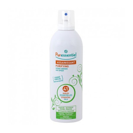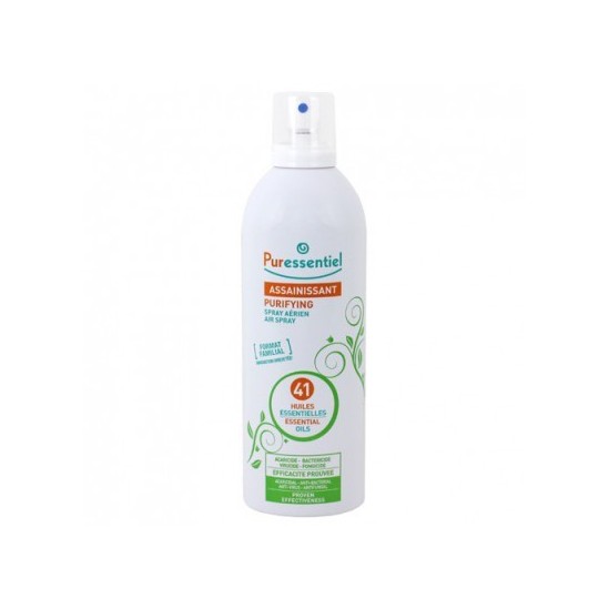 Puressentiel Assainissant Spray 41 Huiles Essentielles assainit l'air d'une pièce, d'une voiture, du bureau, chambre, WC, cuisine, chambre de malade... et contribue au dégagement des voies respiratoires, évite les sources d'allergies.