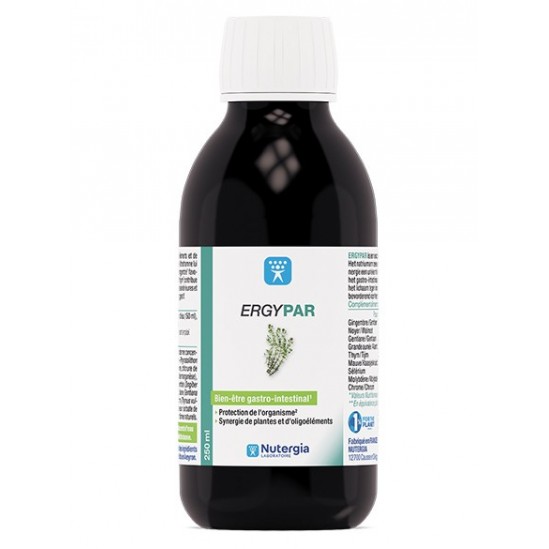 ERGYPAR contient noyer et gentiane, qui soutiennent le fonctionnement du tractus intestinal, et gingembre et thym qui contribuent à la résistance contre les microorganismes et aident au soutien de la digestion.